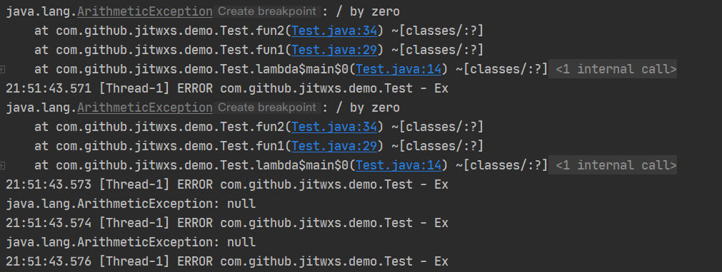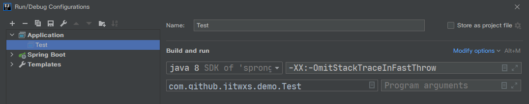 除此之外,我们可以通过指定 OmitStackTraceInFastThrow 这个 JVM 参数去关掉这个优化,仅需要在应用启动参数中添加如下即可: