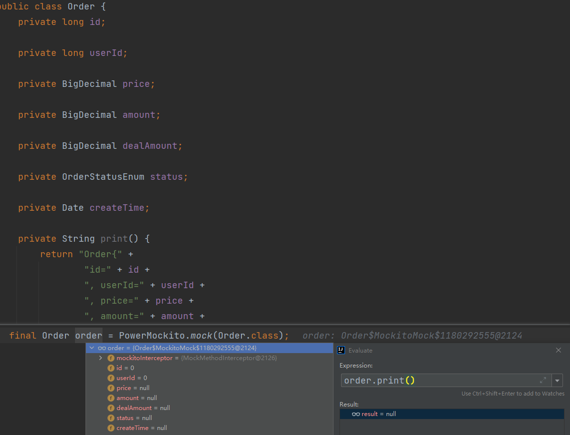 在对某个类使用 Mock 后。那么该类的所有成员变量都会置为默认值,所有的方法实现也会置空,便于后续自定义实现。如下图所示,对于类 Order,其成员变量被设置成默认值,其方法 print() 实现也被清空,方法返回了默认值。