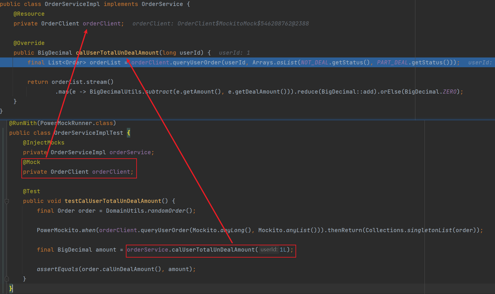 如上图所示,当我对 OrderService 使用 InjectMocks 后,其被 mock 的成员变量 OrderClient 被自动注入其中,并且调用 OrderService 的方法时,走的是真实逻辑。